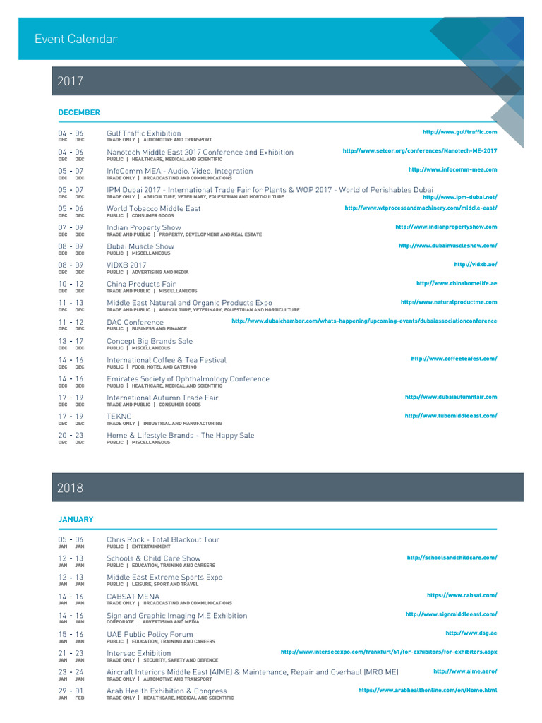 The document provides a calendar. Visiting or hosting an event in dubai? The calendar provides the dates and urls for over 50 events in 2023 spanning various industries like healthcare, construction, trade shows and more.